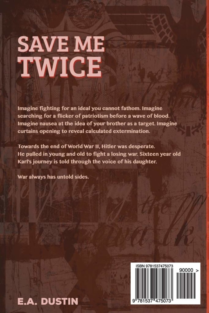 Save Me Twice by E.A. Dustin is a heart wrenching historical novel set in Germany between October 1944 – October 1945. The novel is grounded in fact as it is based on the author’s father’s wartime experiences. It is a marvellous, comprehensive and horrifying read.