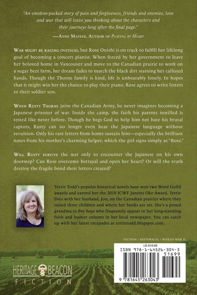 War might be raging overseas, but Rose Onishi is on track to fulfill her lifelong goal of becoming a concert pianist. When forced by her government to leave her beloved home in Vancouver and move to the Canadian prairie to work on the Thornes’ sugar beet farm, her dream fades to match the black dirt staining her callused hands. Though the Thorne family is kind, life is unbearably lonely. In hopes that it might win her the chance to play their piano, Rose agrees to write letters to their soldier son.
