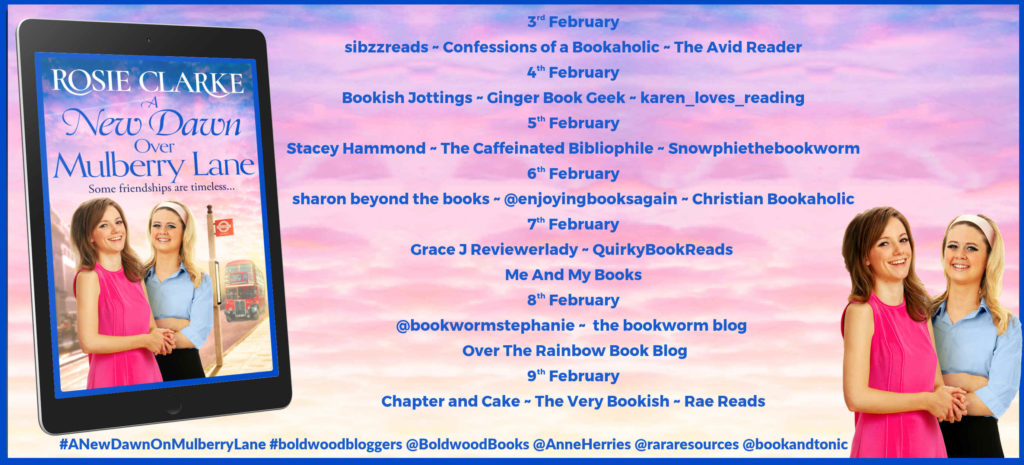 A New Dawn Over Mulberry Lane by Rosie Clarke is a marvellous historical novel set in 1958. It is the eighth book in the Mulberry Lane series but can be read as a stand-alone. This was my first trip to Mulberry Lane and I loved it. The background to all the characters was given.