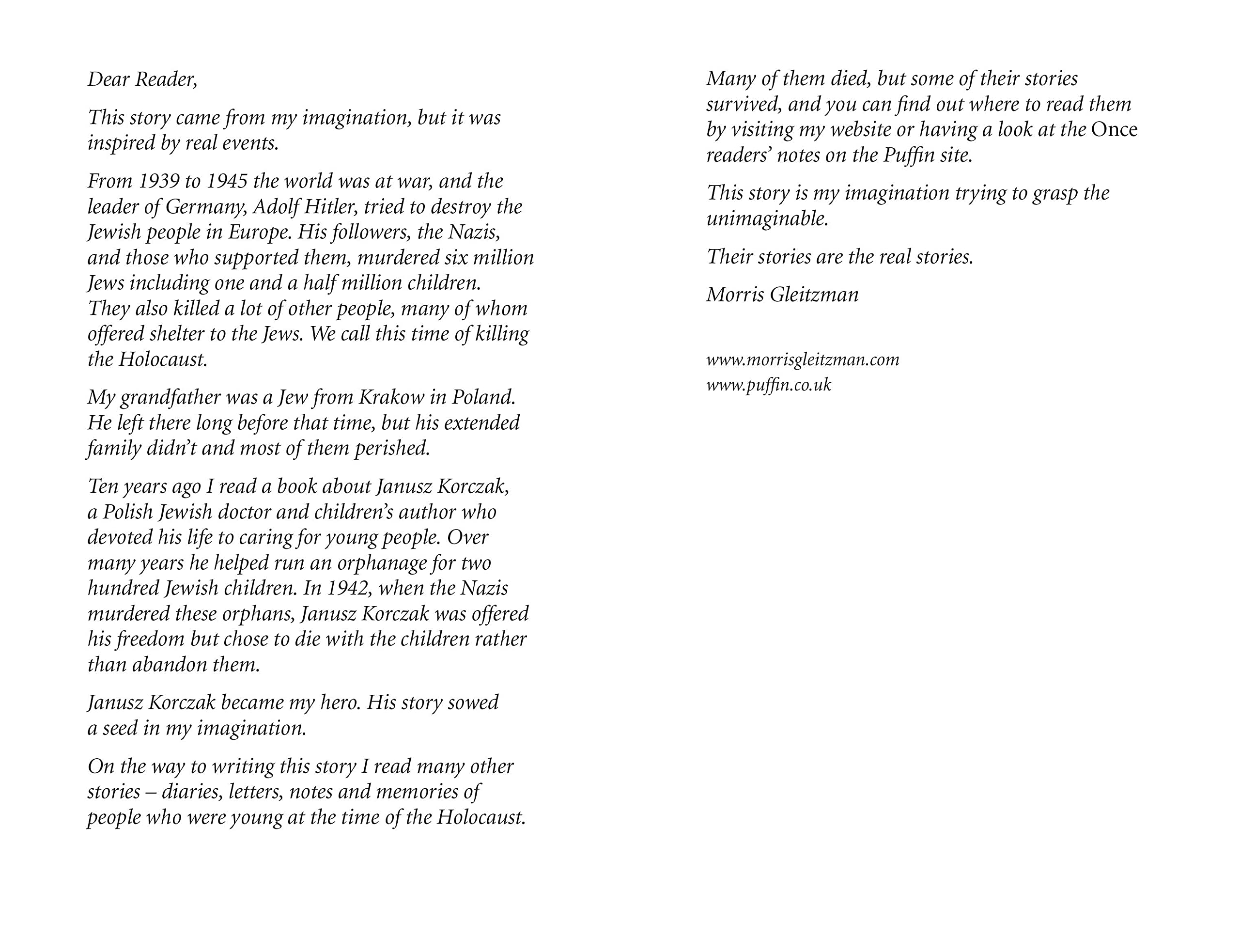 Once by Morris Gleitzman is a powerful and heartbreaking historical children’s novel that is suitable for over ten years old. It is the first book in a seven book series.