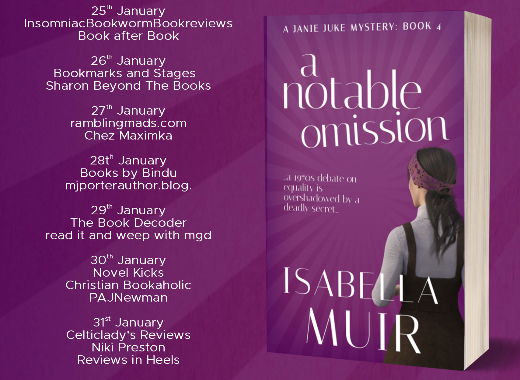 A Notable Omission by Isabella Muir is an historical novel set in 1970. It is the fourth book in the Janie Juke Mystery series but can be read as a stand-alone.