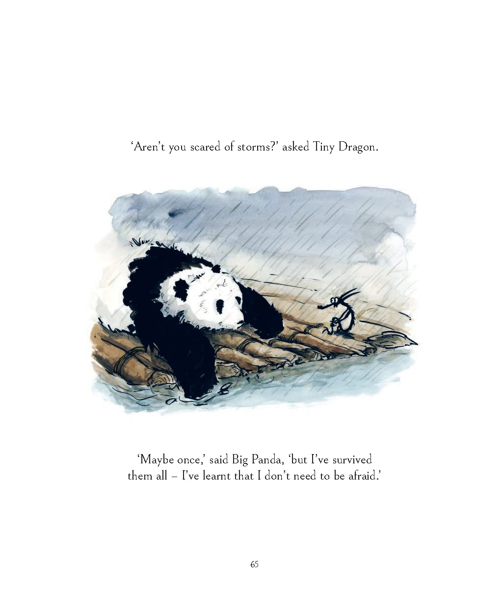 Big Panda is very wise. He helps to calm Tiny Dragon by imparting knowledge as the pair travel from their home across the river. Tiny Dragon wonders why Big Panda is so wise. Big Panda tells him that he has lived longer and experienced more.
