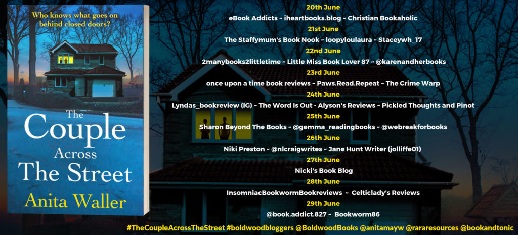 The Couple Across The Street by Anita Waller is a totally gripping contemporary psychological thriller that I just could not put down.