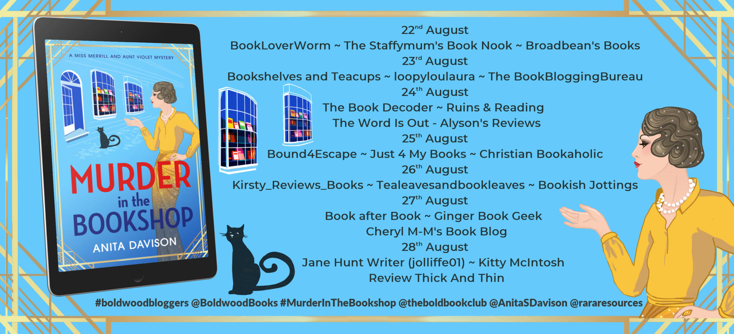 Murder In The Bookshop by Anita Davison is a fabulous historical novel that entertained me from the start. It is part of A Miss Merrill & Aunt Violet Mystery series but can be read as a stand-alone.