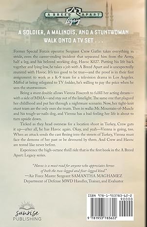 Former Special Forces operator Sergeant Crew Gatlin takes everything in stride, even the career-ending incident that separated him from the Army, half a leg, and his beloved working dog, Havoc K027. Putting his life back together and lying low, he takes a job with A Breed Apart and is unexpectedly reunited with Havoc. It’s too good to be true—and the proof is in their first assignment: to work as a K-9 team for a television drama in Los Angeles. Miffed at being relegated to TV fodder, he’s willing to pay the price when he sees the stuntwoman.