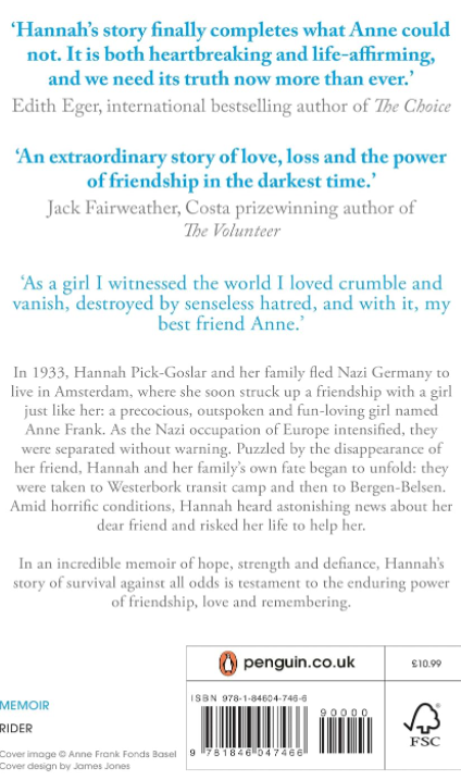 Hannah Pick-Goslar was an amazingly brave teenager who endured so much. To her dying breath, aged ninety three, she spoke of the Holocaust, to educate future generations and to keep memories alive. She said of Anne Frank: she was “a symbol… of all the hope and promise that was lost to hatred and murder.”
