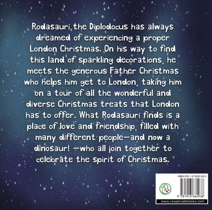 Rodasauri the Diplodocus has always dreamed of experiencing a proper London Christmas. On his way to find this land of sparkling decorations, he meets the generous Father Christmas who helps him get to London, taking him on a tour of all the wonderful and diverse Christmas treats that London has to offer. What Rodasauri finds is a place of love and friendship, filled with many different people—and now a dinosaur! —who all join together to celebrate the spirit of Christmas.