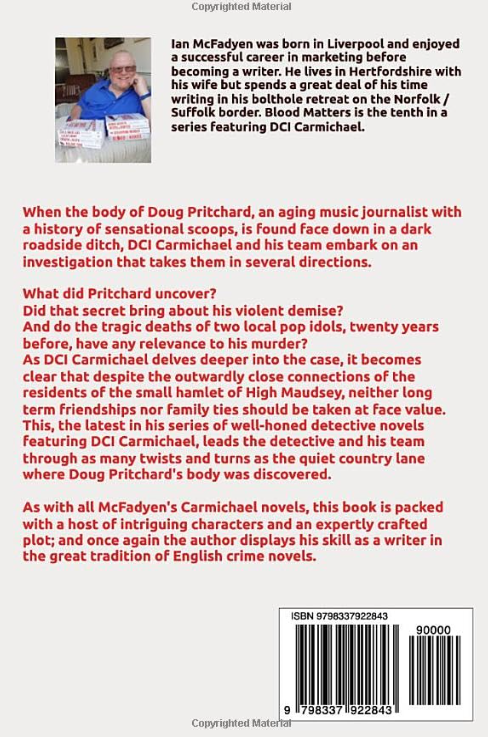 Ian McFadyen was born in Liverpool and enjoyed a successful career in marketing before becoming a writer. He lives in Hertfordshire with his wife but spends a great deal of his time writing in his bolthole retreat on the Norfolk / Suffolk border. Blood Matters is the tenth in a series featuring DCI Carmichael.
