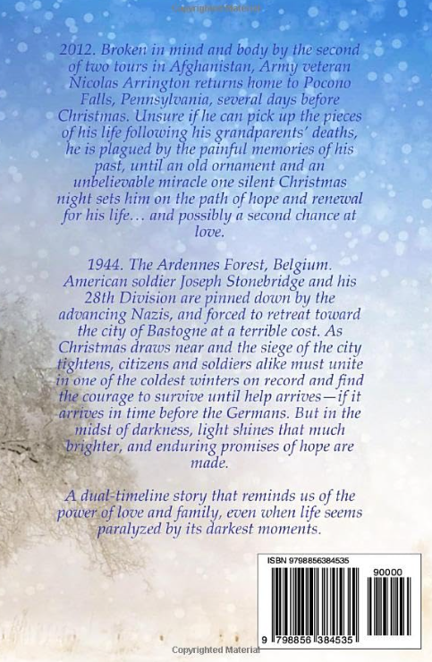 The novel is set in the Ardennes, Belgium in 1944 and also in small town America in 2012. Both stories are set just before Christmas and are similar but different as we follow two serving soldiers – one in World War II and the other invalided out after an IED in Afghanistan.