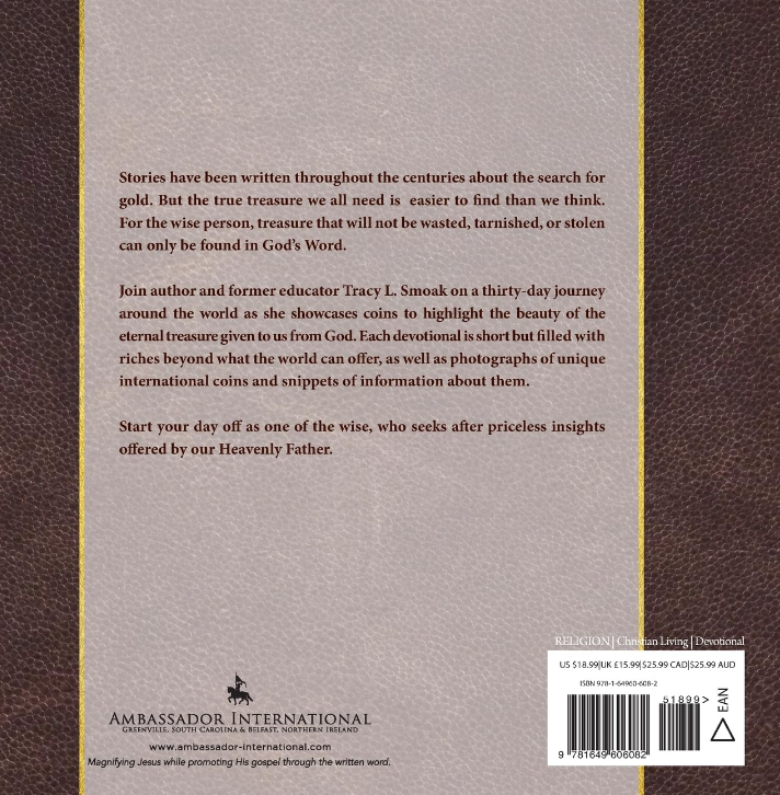 Each devotional has an accompanying coin which is from the author’s collection and means something to her. The coin reminds us that we are God’s treasure, far more important than wealth. We are God’s riches.