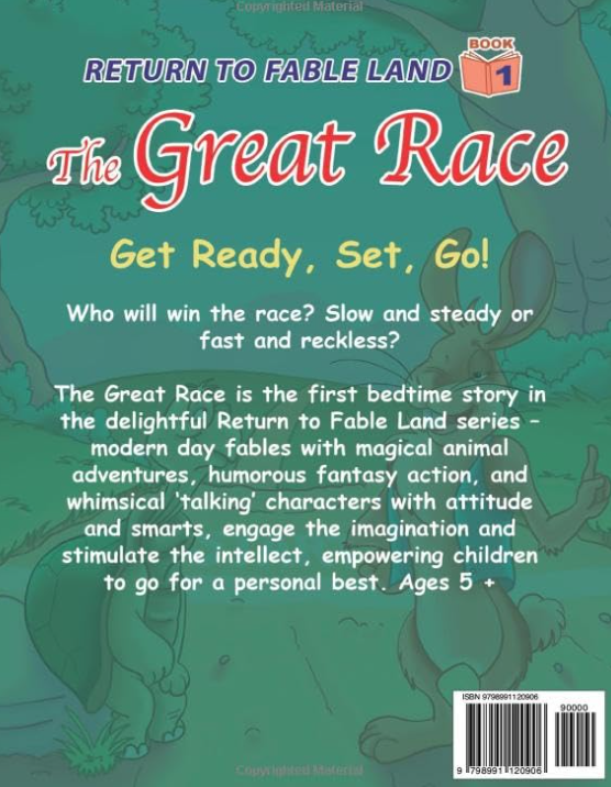 The Great Race is the first bedtime story in the delightful Return to Fable Land series – modern day fables with magical animal adventures, humorous fantasy action, and whimsical ‘talking’ characters with attitude and smarts, engage the imagination and stimulate the intellect, empowering children to go for a personal best. Ages 5 +