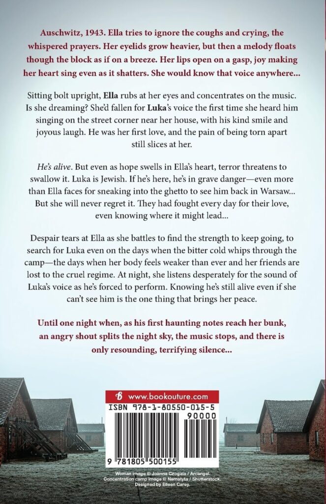 Auschwitz, 1943. Ella tries to ignore the coughs and crying, the whispered prayers. Her eyelids grow heavier, but then a melody floats through the block as if on a breeze. Her lips open on a gasp, joy making her heart sing even as it shatters. She would know that voice anywhere…
